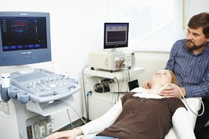 Bei dieser Untersuchung werden die Blutflußgeschwindigkeiten in den großen Halsschlagadern (A.carotis communis, A.externa und A.interna) und den Nackenarterien (A.vertebralis) aufgezeichnet.