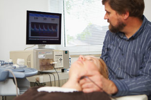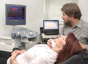 Bei dieser Untersuchung werden die Blutflußgeschwindigkeiten in den großen Halsschlagadern (A.carotis communis, A.externa und A.interna) und den Nackenarterien (A.vertebralis) aufgezeichnet.