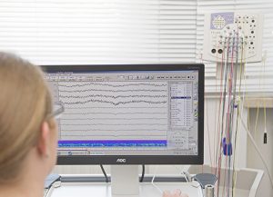 Das EEG ist eine Untersuchungsmethode mit deren Hilfe man die elektrische Aktivität des Gehirns mit Oberflächenelektroden, die mit einer Haftpaste auf die Kopfhaut aufgesetzt werden, aufzeichnen kann. Die Ableitung eines EEG erfolgt überwiegend bei geschlossenen, mehrfach auch bei kurz geöffneten Augen in Ruhe. Um krankhafte Veränderungen besser darstellen zu können, muß manchmal eine Untersuchung mit einer Provokationsmethode erfolgen. Hierzu gehören eine vermehrte und vertiefte Atmung (Hyperventilation), Lichtblitzstimulation mit einer Fotolampe (Fotostimulation) und Schlafentzug mit anschließender EEG Ableitung.