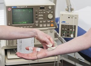Nach elektrischer Reizung können mit Oberflächenelektroden von Zielmuskeln Potentiale abgeleitet werden. Eine Nervenschädigung ist an einer verlangsamten oder fehlenden Reizantwort zu erkennen. Die Untersuchung wird zumeist an einer Reihe verschiedener Nerven durchgeführt.